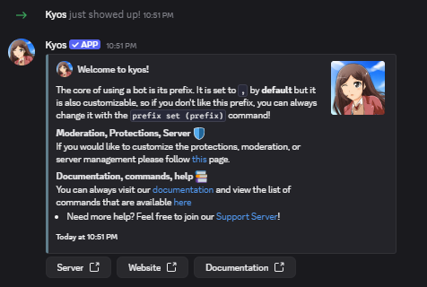After inviting kyos, you should receive a message containing some basic information on the bot. If not, don’t worry! Just keep following the steps.