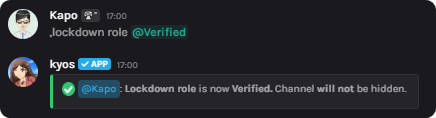 The lockdown system allows you to lockdown channels inside your server. You can setup a dedicated role for the lockdown system, whether to hide the channel upon lock, or ignore channels from the lockdown all function. Aside from most bots defaulting for the @everyone role, this provides customization.Setting the lockdown role