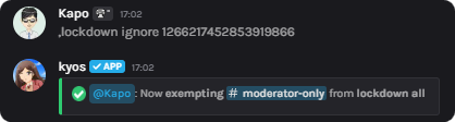 Upon using lockdown all, you may want to ignore certain channels. With this, you can do it. If you wish to remove an ignored channel, just re-execute the command.
