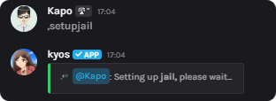 setupjail command, kyos will setup a jail channel and role along with channel permissions.Jailing a user will give them a role in which they can only see the